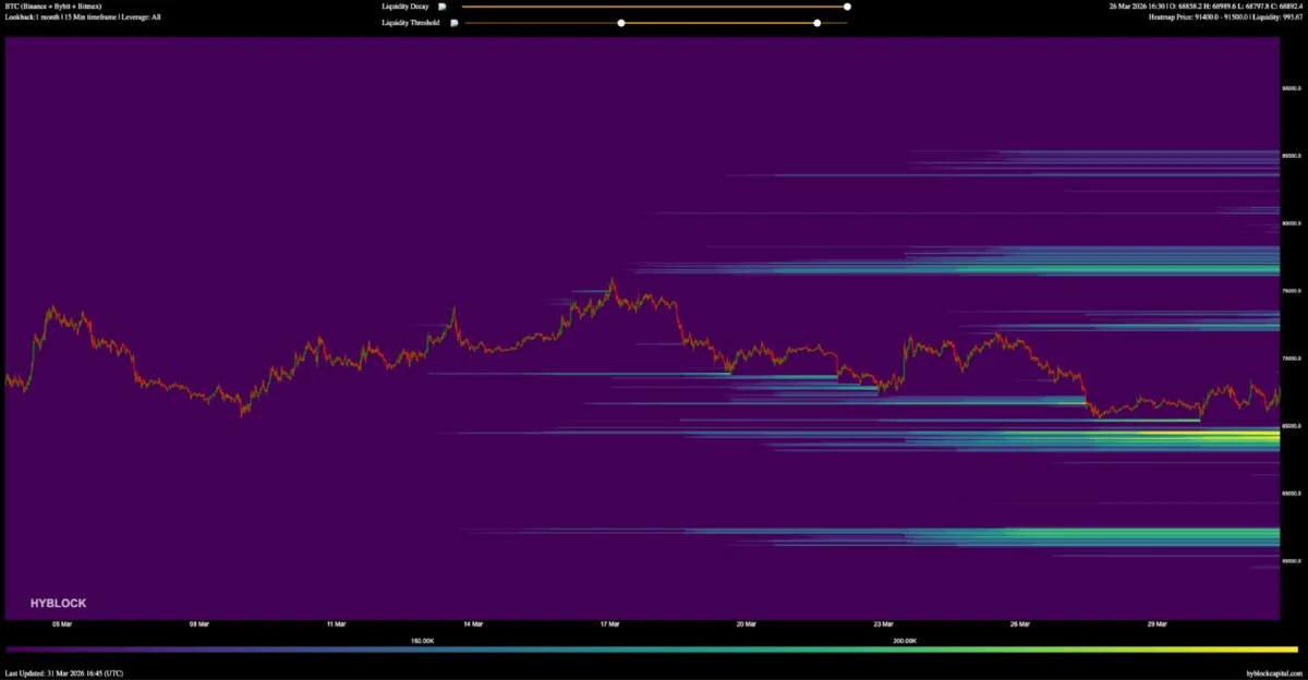 On the other hand, a compelling technical argument, bolstered by Bitcoin’s recent resilience against adverse macroeconomic and geopolitical events, points towards a strong potential for a liquidation rally. The confluence of the 38.2% Fibonacci retracement level at $68,879, a visible range volume profile gap, and significant clusters of short liquidations positioned between $68,500-$70,000 and $72,000-$74,000, creates a highly charged environment for an upward breakout. Should Bitcoin successfully flip the $68,879 level, these technical factors suggest a rapid ascent towards $82,000, driven by forced short covering.